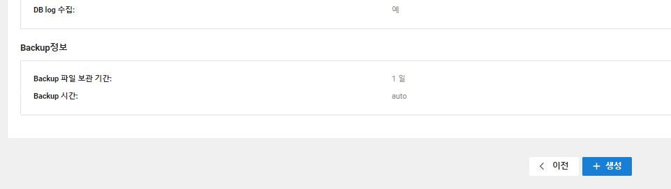 4. 입력한 설정 정보가 맞는지 확인후 '생성' 클릭하면 DB Server가 생성된다.