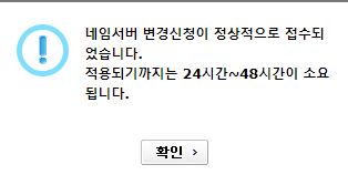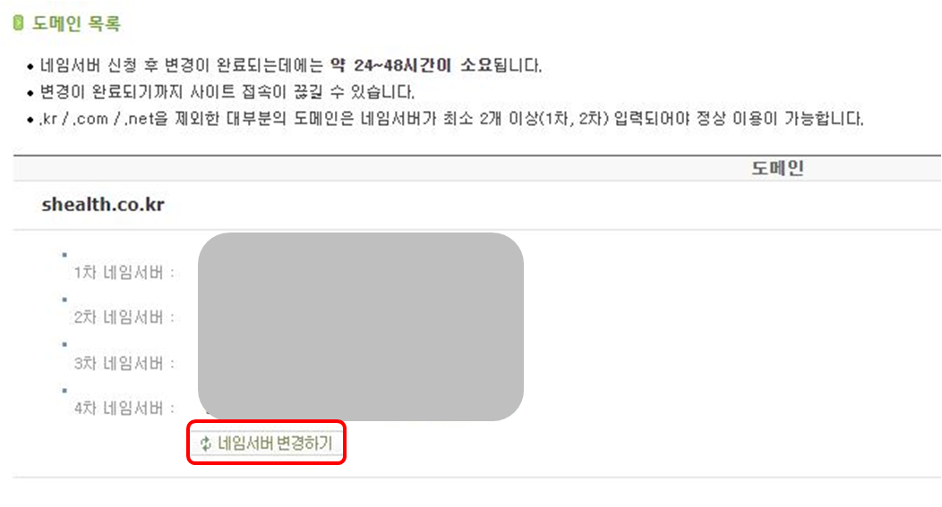 3. '네임서버 변경하기' 버튼을 눌러줍니다. 회색박스는 원래 쓰던 네임서버입니다. 본인인증까지 마쳐줍니다.