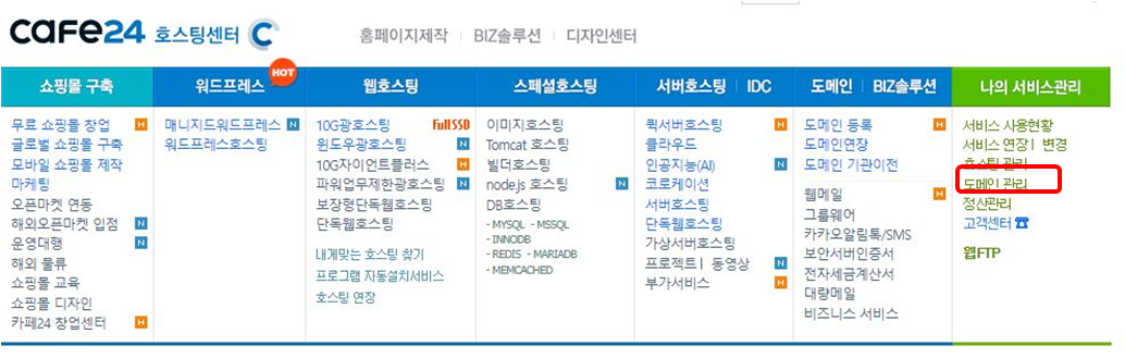 1. 카페 24 [나의 서비스관리 > 도메인 관리] 메뉴로 이동합니다.