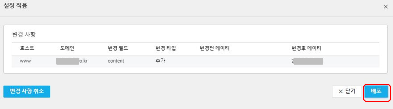 설정 내용 확인하고 '배포' 버튼 클릭.