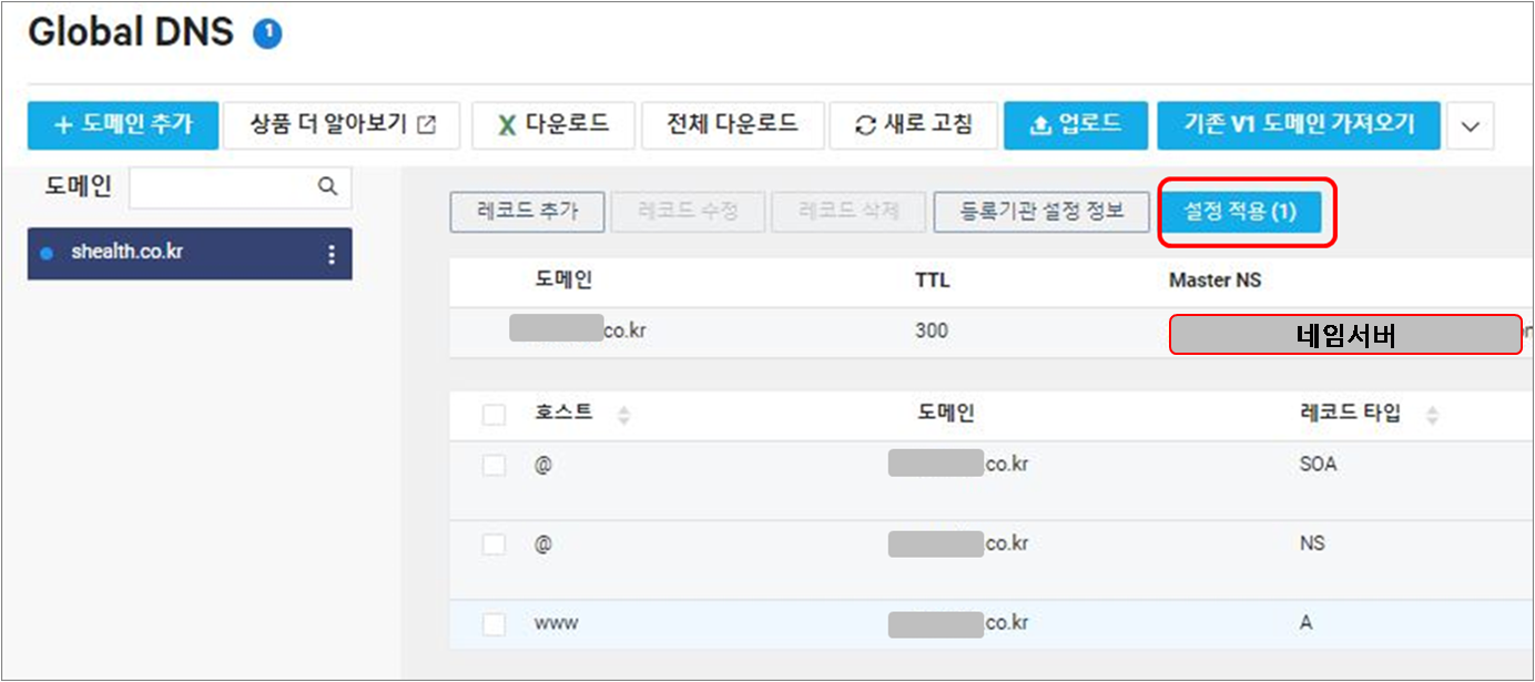 6. 설정한 내용을 확인하고 '설정 적용' 버튼을 클릭합니다. 오른쪽 부분에 네임서버는 카페 24에 등록할 네임서버입니다.