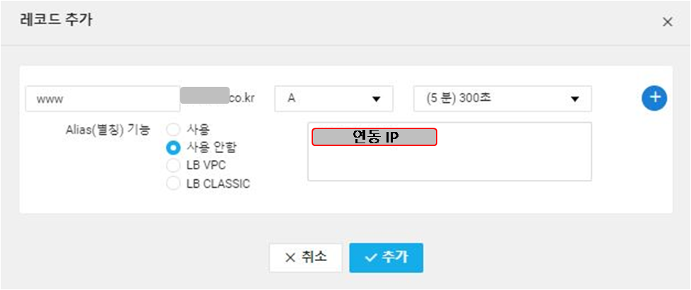 5. 도메인 앞에 'www'를 입력하고, 레코드 타입은 A로 설정합니다. 연동할 IP를 입력하고 '추가' 버튼을 누릅니다.