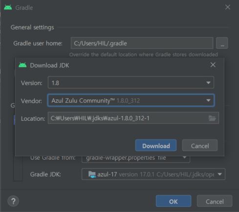 1.8이 없는 경우 'Download JDK' 클릭 -> Version 1.8 다운로드 -> OK
