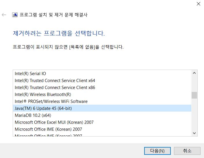 4. 이 창 전에 '제거' 버튼을 눌러준다. 그러면 제거할 수 있는 프로그램이 아래처럼 뜬다. 이 중에 삭제하려는 프로그램을 선택한다. 다행히 Java6이 있다.
