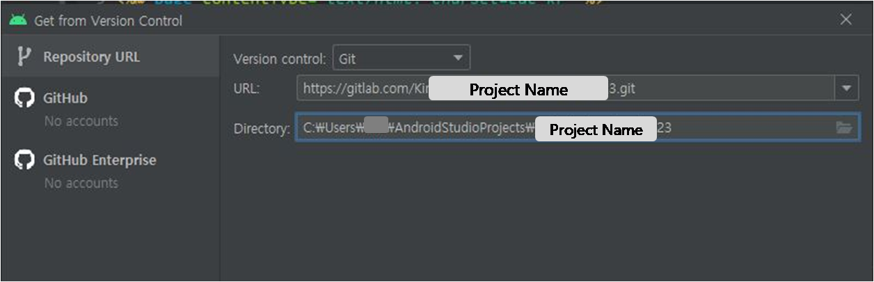 2. Version control,을 'Git'으로 선택하고, URL에 가져올 git 주소를 입력한다. 아래 'Clone' 버튼 누르면 프로젝트 가져오기(git clone) 완료